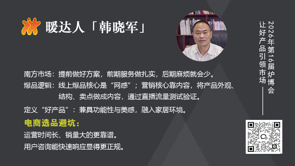 爐具是大件,用戶最在意“安裝后能否讓房間升溫”,很多客戶會(huì)要求簽合同,比如“我家房子保溫好,若爐具達(dá)不到25度,全款退貨,達(dá)標(biāo)就立刻下單”。尤其今年南方用戶采暖需求上升,但南方用戶對(duì)水暖爐具帶暖氣片、地暖或風(fēng)盤(pán)的認(rèn)知弱,擔(dān)心產(chǎn)品匹配不好,來(lái)回退貨,所以對(duì)“暖和”的訴求更迫切。而北方有專業(yè)的水暖工把關(guān),相對(duì)好一些。